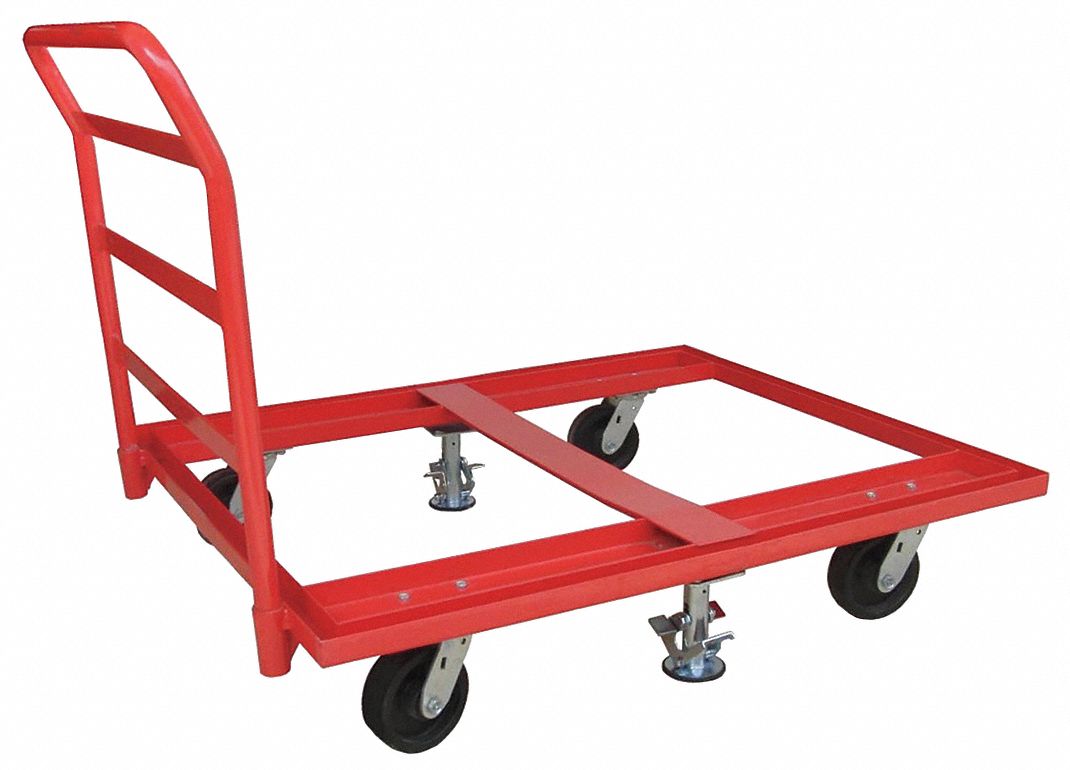 Pallet dollies have a flat surface for moving various types and sizes of pallets.